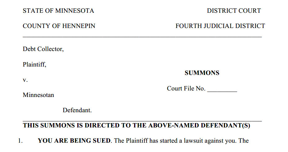 A lawsuit in Minnesota starts with a Summons and Complaint. This is a legal document that is supposed to be served (handed to) the Defendant or a responsible looking adult at their last known address. A summons looks like the picture below.
