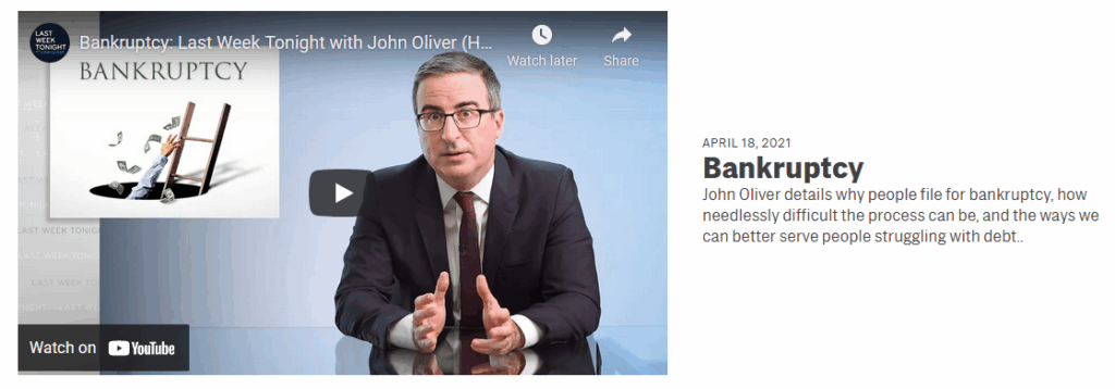 The realities of filing bankruptcy are rarely mentioned on regular media, but on 4/18/2021 John Oliver Tonight did an episode about it.